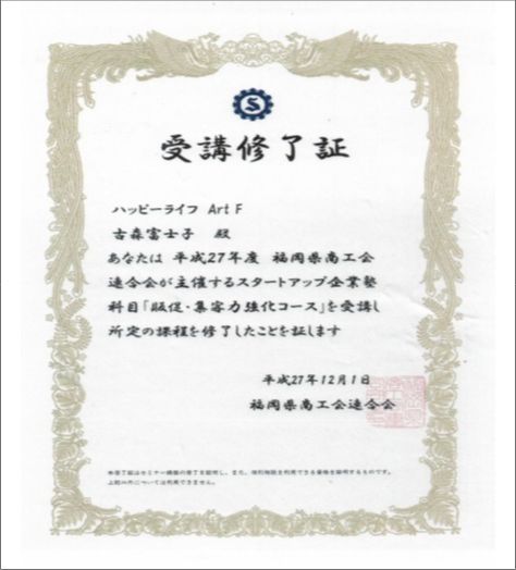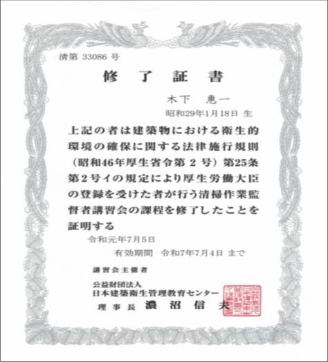 資格 | 建築物環境衛生管理技術者 第29787号 清掃作業監督者 清第33086号 清掃統括管理者 清第12507号 品質マネジメント審査員登録 JRCA QMS審査員補 A21833 第一種電気工事士 兵庫18862号 第一種衛生管理者 第40014434551号 (社)日本収納カウンセラ-協会 整理収納学第24期 (社)日本収納カウンセラ-協会 心理カウンセラ-資格 実用新案 3221928号 実用新案 3222554号 |